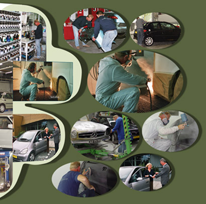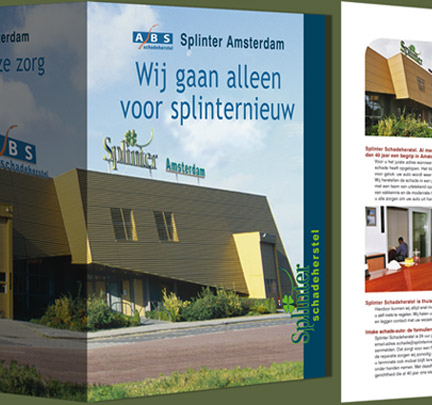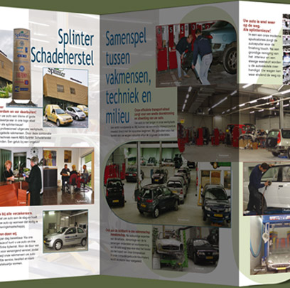 Uitklapfolder voor ABS Splinter Schadeherstel: ontwerp, dtp en, samen met de fotograaf, de fotografie. Grote foto 63 cm breed. Met uitgestanst klaverblad, uit logo Splinter.