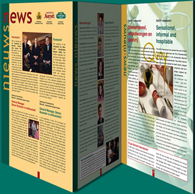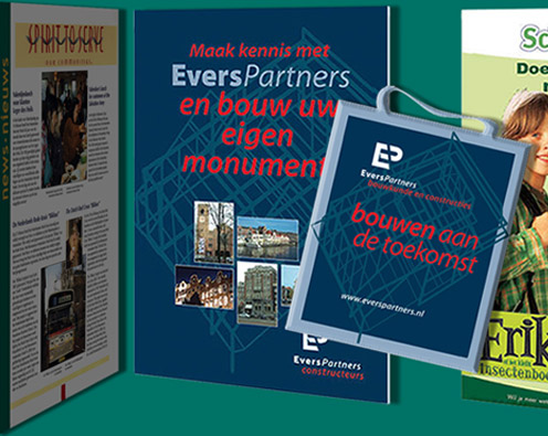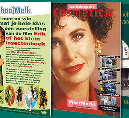 News/Nieuws voor en van drie Amsterdamse hotels. Poster en tas voor EversPartners constructeurs. Posters voor Campina schoolmelk, Golff supermarkten en Cosmetica voordeelmagazines van MeerMarkt.