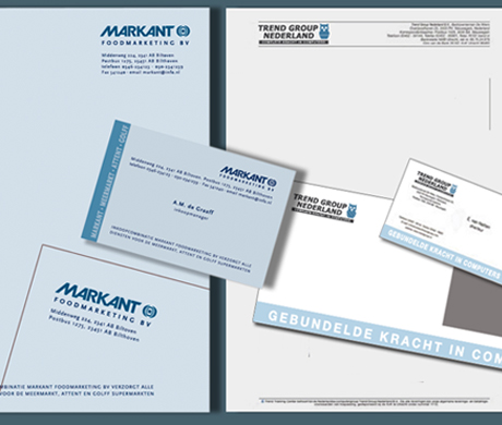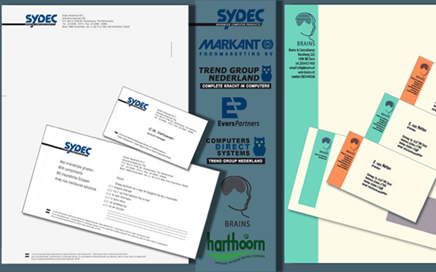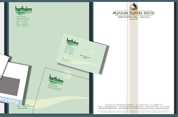 Huisstijlen en logo's voor Sydec Nederland, Brains Beheer, Markant Foodmarketing, EversPartners, Computers Direct Systems, Trend Group Nederland en Harthoorn Handelmij., Museum Square hotel, ComOp van Accor Hotels.