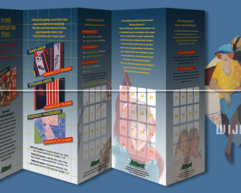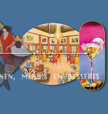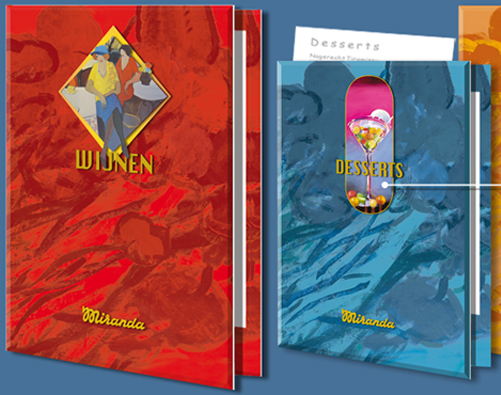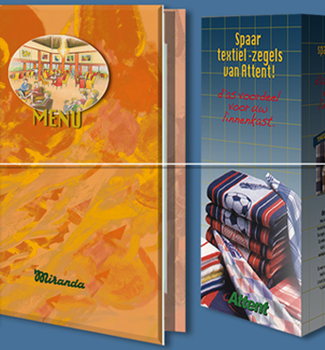 Spaarkaart voor de Attent supermarkten. Wijn-, menu- en dessertkaart met inlegvellen, voor het Miranda paviljoen. Met illustraties.